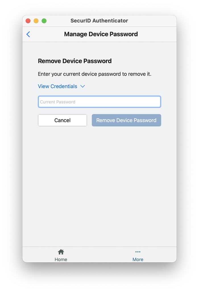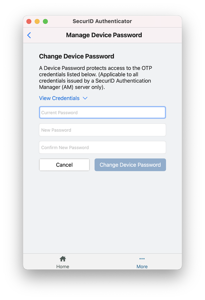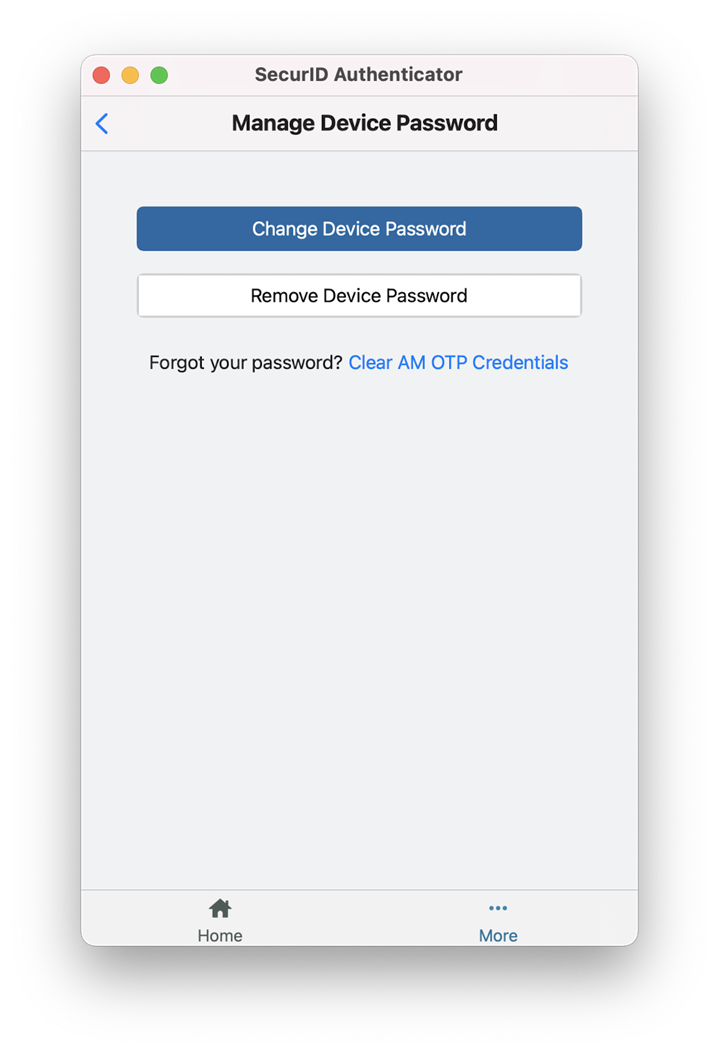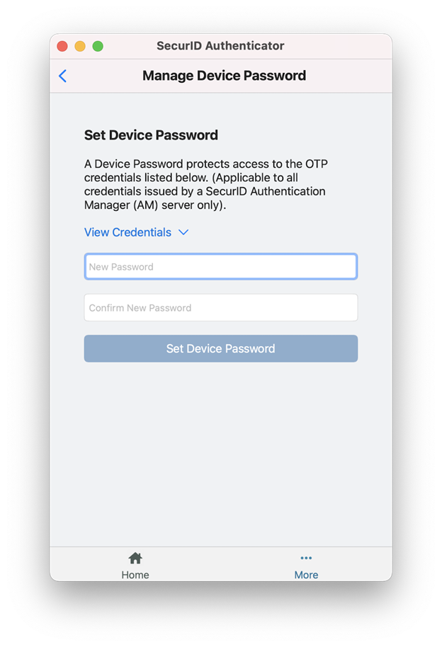 您可以通过在 SecurID Authenticator 5.1 应用中配置设备密码来保护您的 AM OTP 凭据。如果您获得授权,可以通过单击 (...)更多和管理设备密码设置密码来保护您的 AM OTP 凭据。这将确保只有您可以访问、查看和管理凭据。