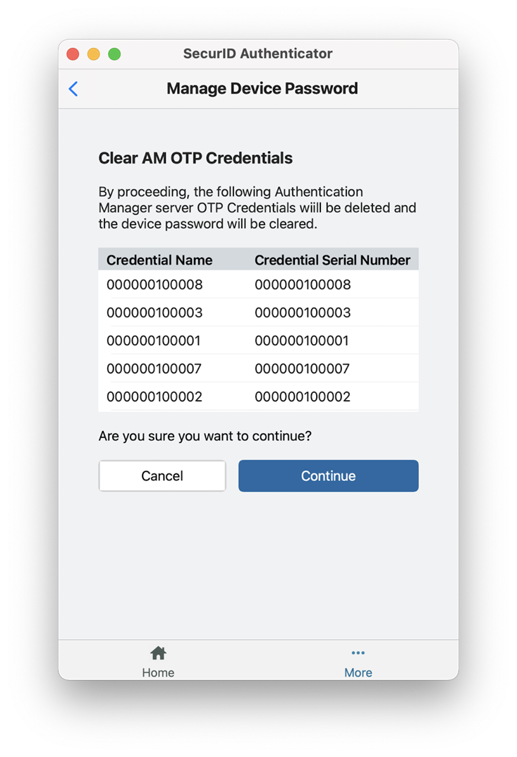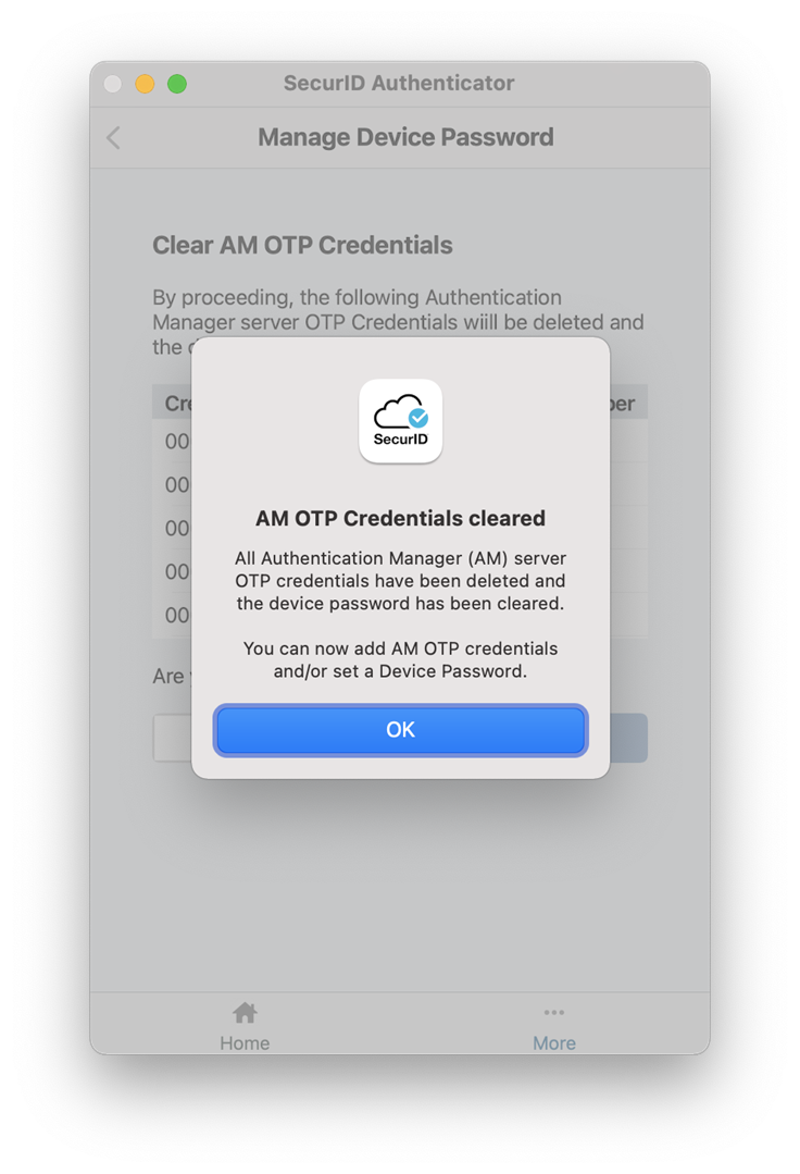 如果忘记了设备密码,则必须清除设备中的所有 AM OTP 凭据,并且必须请求新的凭据。