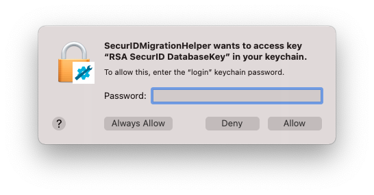 单击并运行 SecurIDMigrationHelper.app 应用程序以迁移 RSA 密钥链条目。